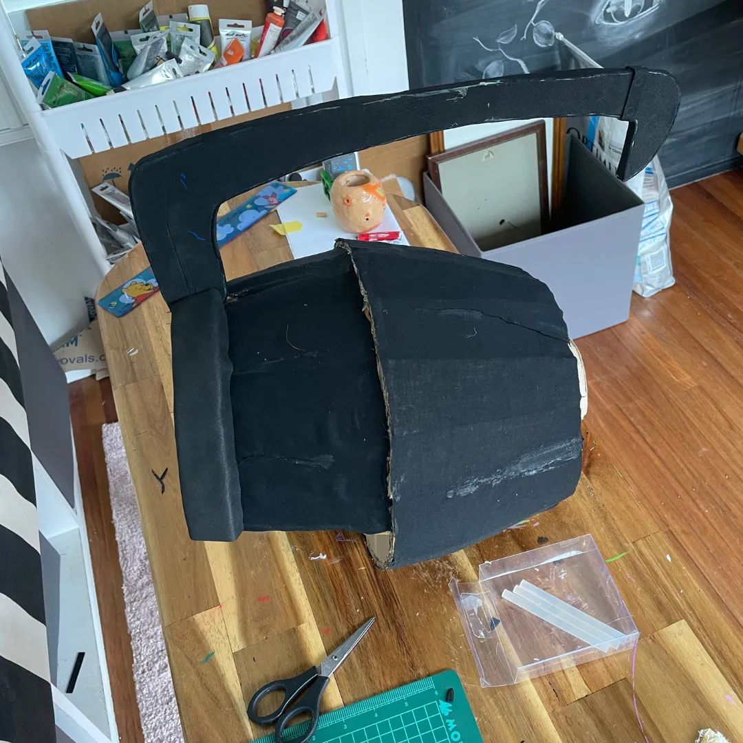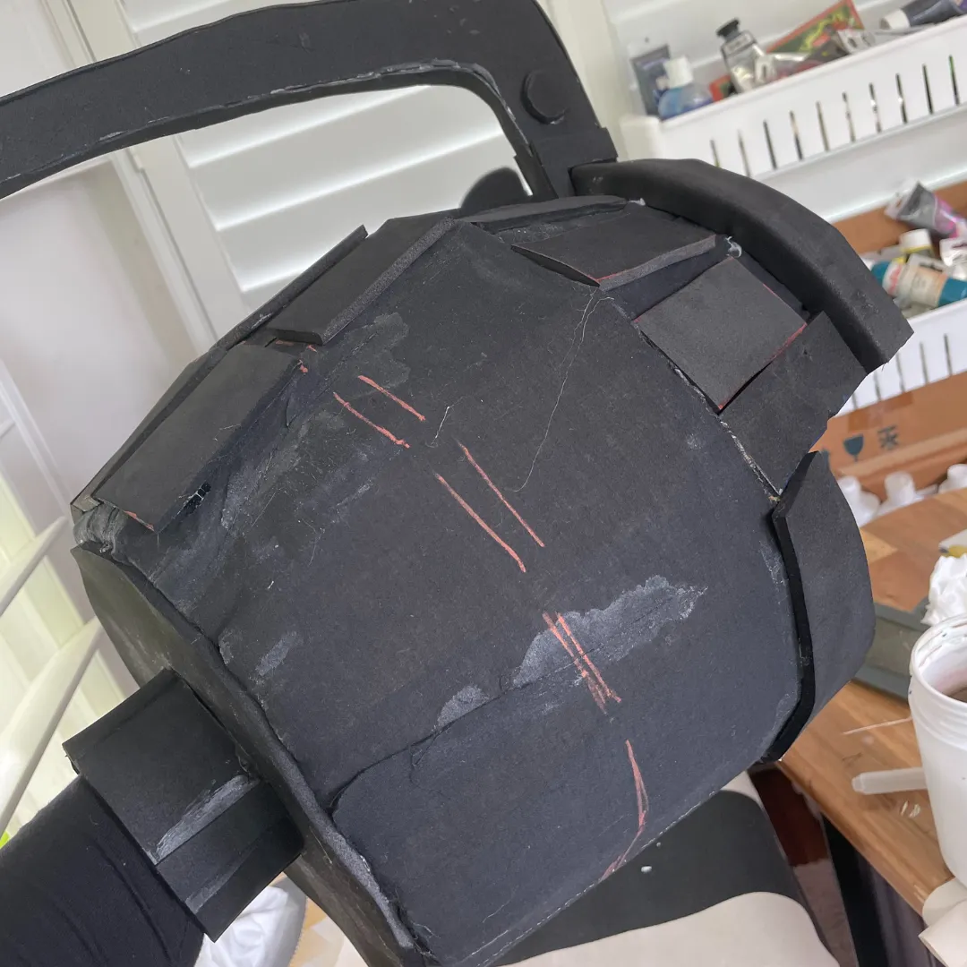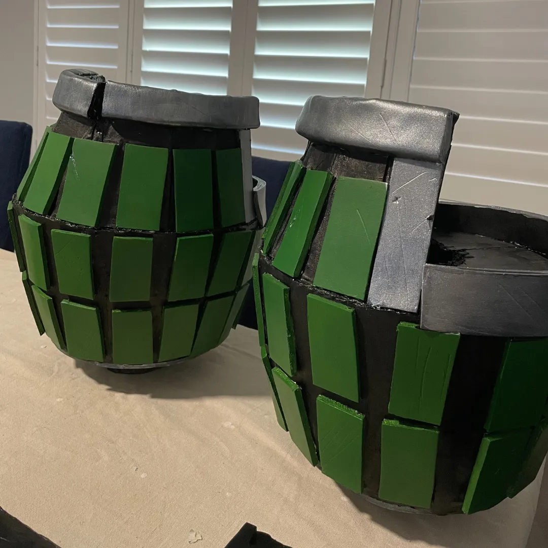 And for the Gauntlets, were the hardest and most time-consuming part. I believe they took over a year for me to complete. They have a cardboard skeleton covered in fabric and EVA foam to build the shape. The grenade parts are also foam and were attached on the outside.