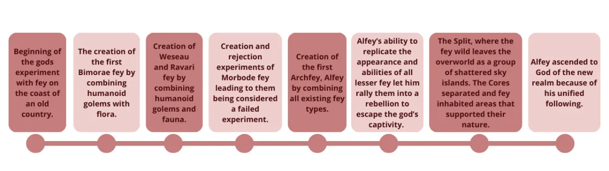 In this new world Alfey ascended to godhood due to his unified following. After the split the fey moved out into different quarters of the Wilds inhabiting biomes that better supported their natures while Archfey built a city in the centre of the plane. As time went on Weseau, Ravari and Brimorae fey each evolved 3 different species based on their overworld connection.