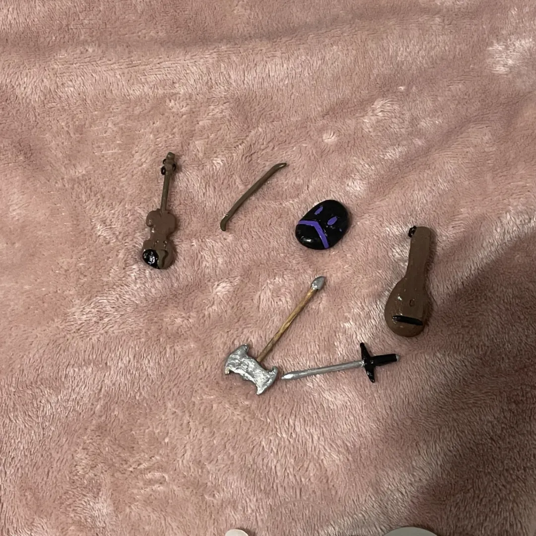 Most of the talismans contained a dice and 2-3 small handmade miniature tools that represent the character such as their weapon or musical instrument.