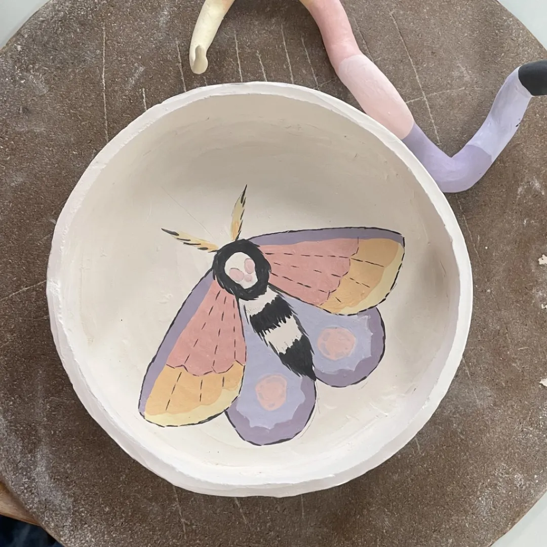 This was the piece with which I learned how different underglazes can be from their pre-fired colours as well as how many layers underglazes need for full coverage, specifically on purple colours.