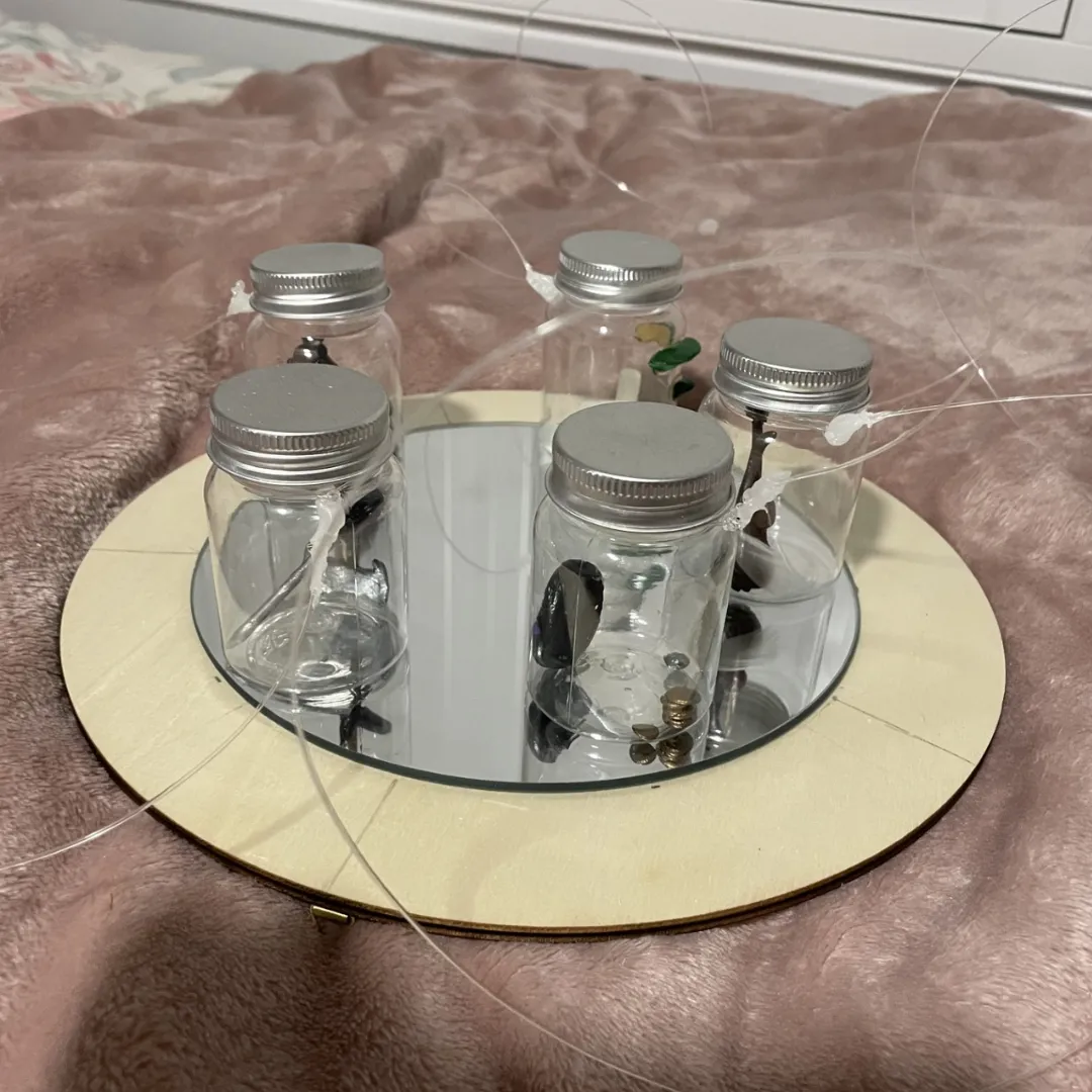 In the end I couldn't attach my talismans to the mirror, so I just presented them under it but, I underestimated the hight of the ceiling, so it didn't really work.